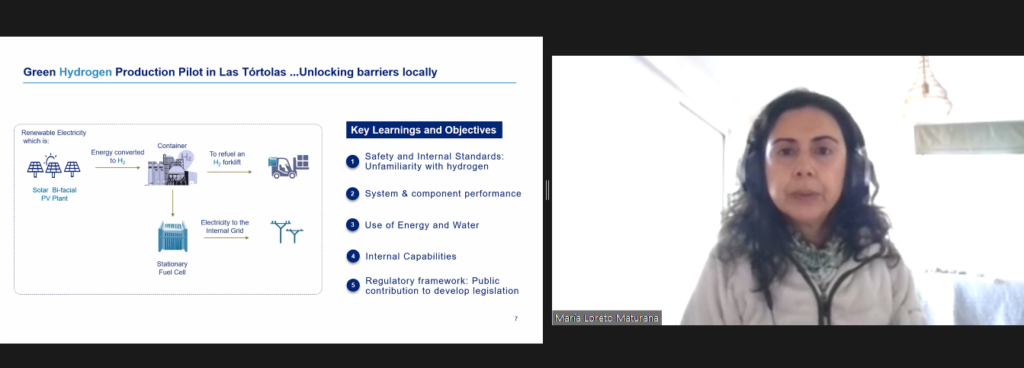 - Y en paralelo, en Chile, también se está trabajando en introducción de hidrógeno en minería, a través de un piloto que produce toda la cadena de valor del hidrógeno verde dentro de las operaciones. Este combustibles es producido por medio de una planta solar, para ser usado en montacargas en sus operaciones.