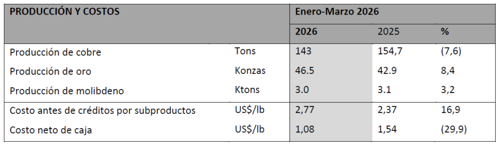 Sin embargo, gracias a una mayor producción de oro (8,4%) y de molibdeno (3,2%), junto con mejores precios de estos subproductos, el costo neto de caja del Grupo disminuyó en un 30% comparado con el mismo periodo del año anterior, llegando a US$1,08 la libra.