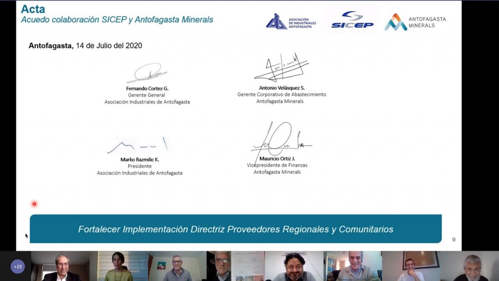 Mauricio Ortiz, vicepresidente de Finanzas de Antofagasta Minerals, destacó que “estamos viviendo momentos muy desafiantes, debido a la pandemia. En este contexto, durante el primer semestre de 2020 hemos incrementado el volumen de contratación con empresas regionales en un 16% con respecto al mismo período de 2019, acumulando un volumen de US$105 millones y haciendo negocios con más de 250 empresas, lo que demuestra nuestra voluntad de concretar más negocios con la región de Antofagasta que nos acoge. Y estamos convencidos que a través de esta colaboración con Sicep, podremos incrementar nuestras interacciones y nos permitirá establecer nuestra manera de hacer las cosas, esto es colaborando y construyendo en la región y para la regiónâ€.