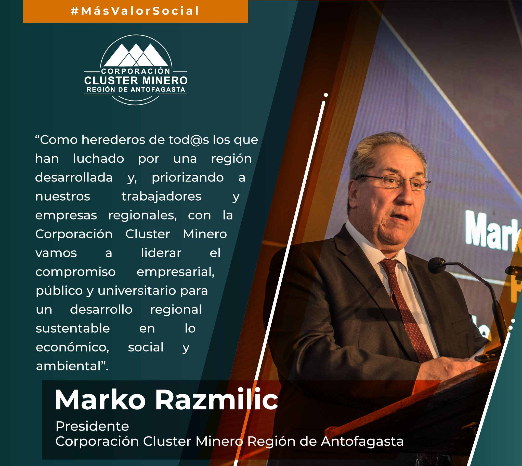 El presidente de la Corporación Cluster Minero Región de Antofagasta, Marko Razmilic, destacó la conformación de esta nueva institucionalidad para liderar el desarrollo de la industria regional de manera independiente, tras pasar de ser un Programa Estratégico Regional con fondos del Estado a ser una Corporación conformada por instituciones públicas y privadas.
