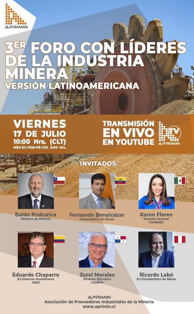 La Asociación de Proveedores Industriales de la Minería, Aprimin, realizará su 3er Foro con Líderes de la Industria Minera – Versión Latinoamericana. El evento contará con la participación del Ministro de Minería, Baldo Prokurika, Karen Flores, gerente general de la Cámara Minera de México; Fernando Benalcázar, viceministro de Minas del Ecuador; Eduardo Chaparro, ex-director Asomineros ANDI – Colombia; Zorel Morales, director ejecutivo CAMIPA – Panamá, y Ricardo Labó, ex-viceministro de Minas del Perú.