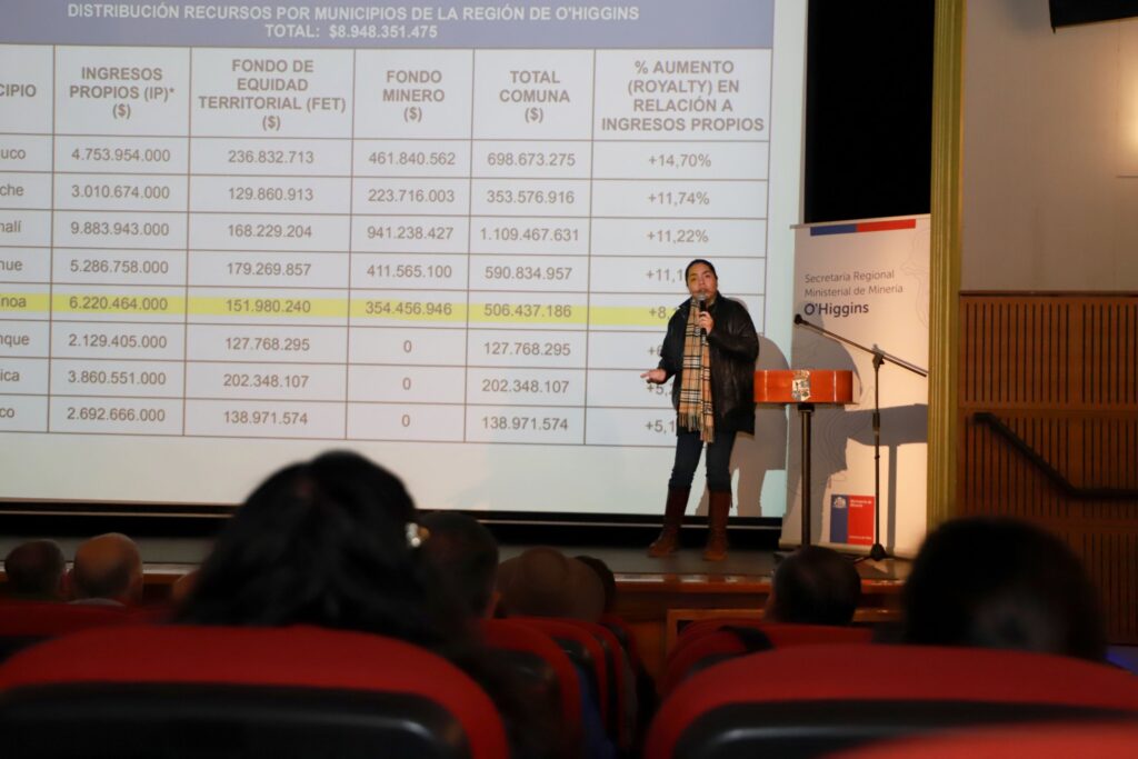 Hasta el teatro de Requínoa llegaron autoridades regionales para dar a conocer los avances en la distribución de los recursos de la Ley de Royalty Minero en O’Higgins.Â