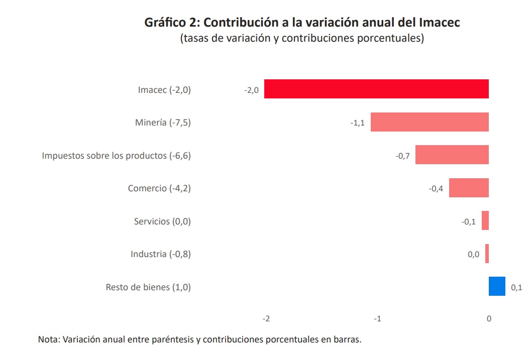 La variación anual del Imacec fue explicada por la caída de la minería y, en menor medida, del comercio. Por su parte, la caída del Imacec desestacionalizado estuvo determinada por el desempeño de la minería.