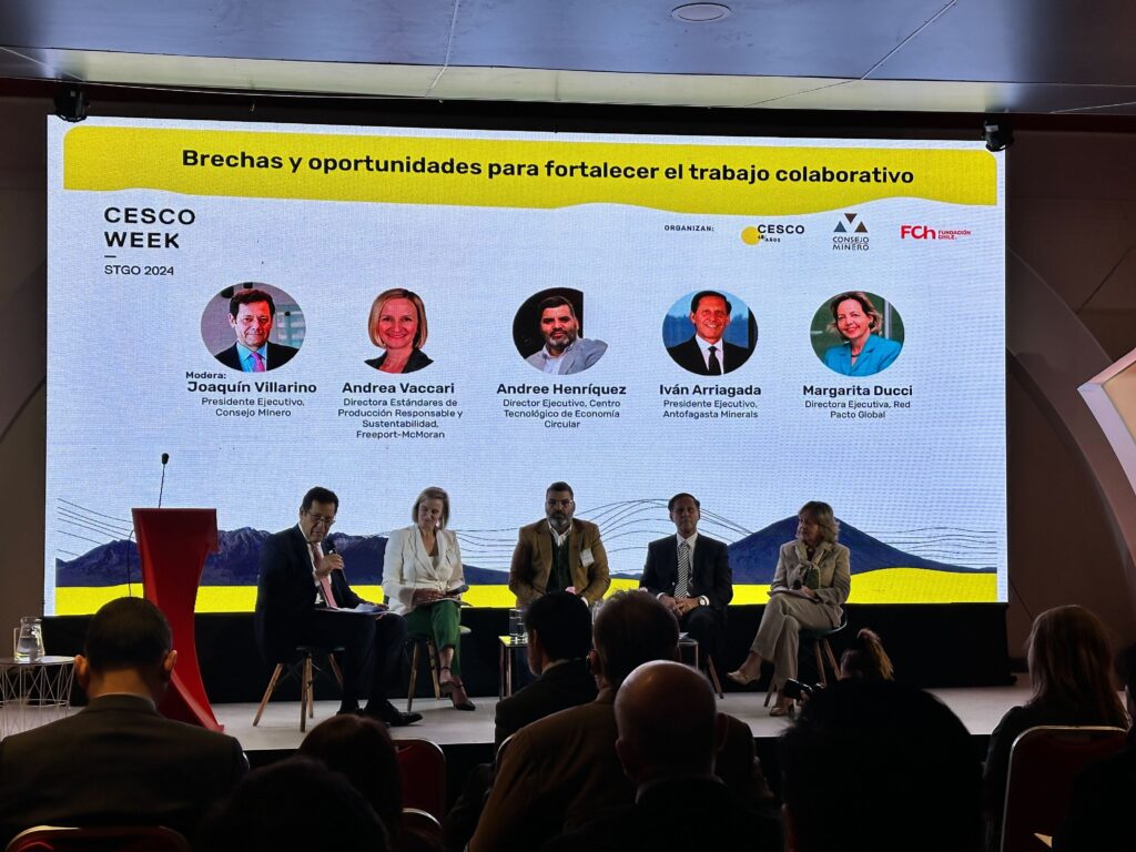 En el marco del evento se realizó el panel denominado «Brechas y oportunidades para fortalecer el trabajo colaborativo», el cual contó con la participación de la directora de Estándares de Producción Responsable y Sustentabilidad de Freeport-McMoran, Andrea Vaccari; el director ejecutivo del Centro Tecnológico de Economía Circular, Andreé Henríquez; el presidente ejecutivo de Antofagasta Minerals, Iván Arriagada; y la directora ejecutiva de Red Pacto Global, Margarita Ducci.