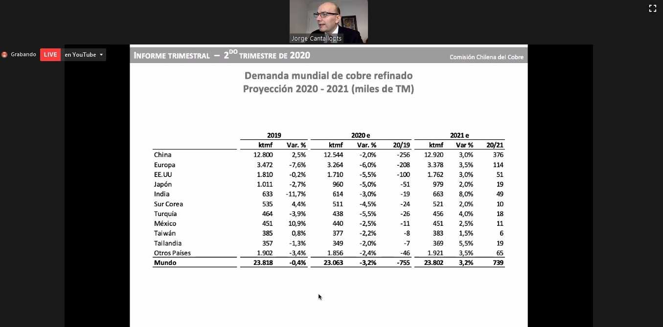 En términos de demanda mundial de cobre refinado, el director de Estudios y Políticas Públicas señaló que se prevé llegue a 23,06 millones de toneladas en 2020, esto es  3,2% menos respecto del año 2019.