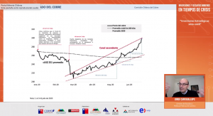 En el marco de su exposición, Jorge Cantallopts, director de Estudios y Políticas Públicas de Cochilco, comentó que los niveles de precio que presenta en la actualidad el cobre son acorde con las tendencias y ciclos, con una mirada al alza apoyada por la rápida reactivación que ha mostrado China, pese a que se mantiene la incertidumbre y la volatilidad del mercado.