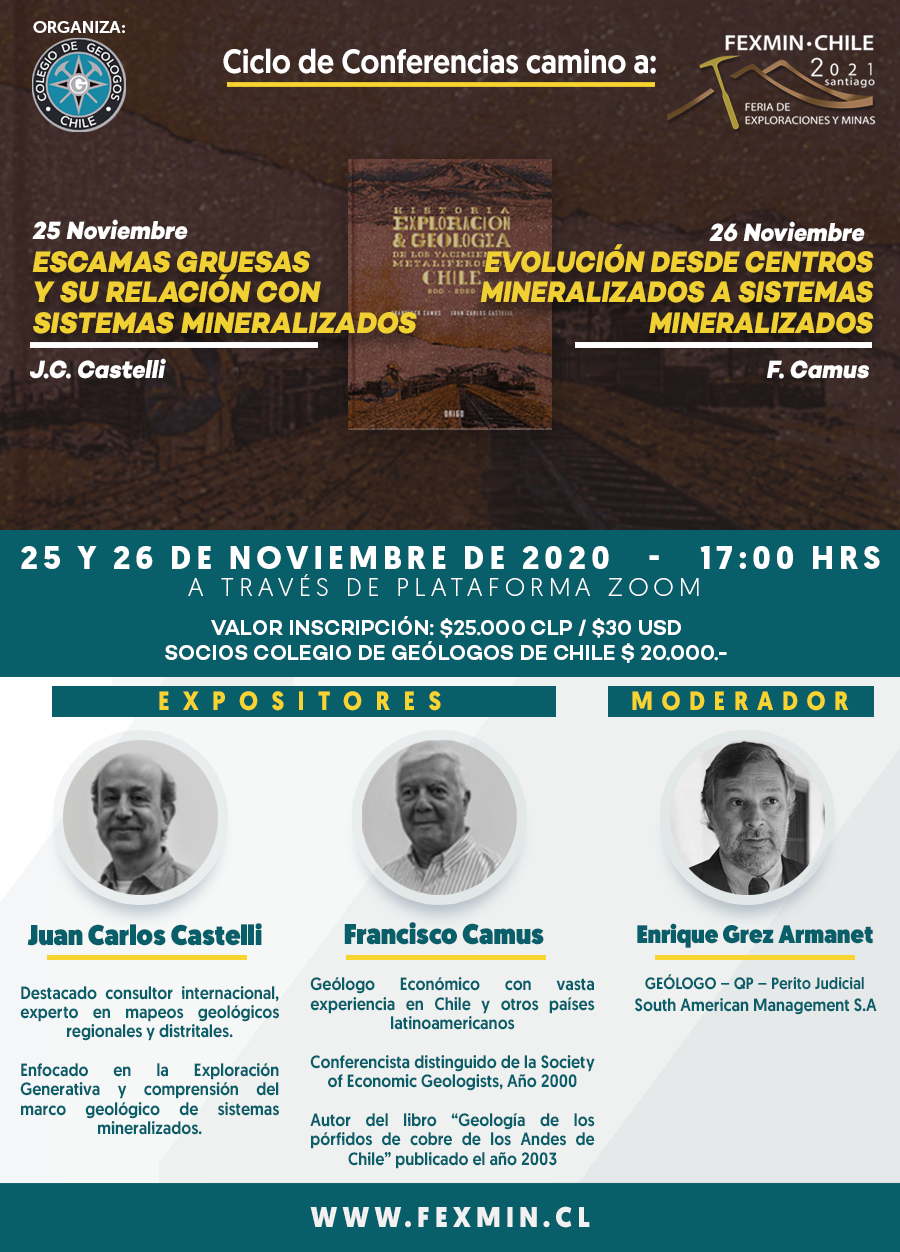 Mientras que el 26 de noviembre se llevará cabo la charla «Evolución desde centros mineralizados a sistemas mineralizados», a cargo de Francisco Camus, experto con vasta experiencia en Chile y en otros países latinoamericanos. Es además autor del libro «Geología de los pórfidos de cobre de Los Andes de Chile», publicado en 2003.