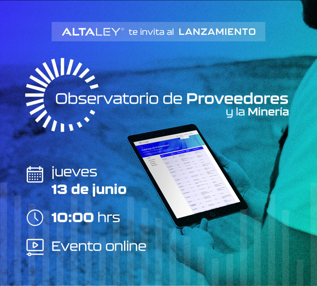 La Corporación Alta Ley realizará este jueves 13 el lanzamiento oficial del “Observatorio de Proveedores y la Mineríaâ€, plataforma pública y abierta que tiene como propósito principal poner a disposición de la comunidad los indicadores más relevantes de la industria minera y sus proveedores, así como habilitar un catálogo detallado de proveedores mineros.