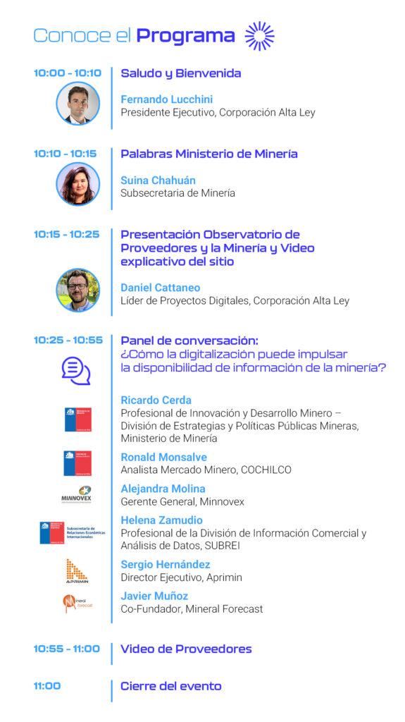 El lanzamiento del observatorio contará con la participación de diversas autoridades y un panel de expertos que representan al ecosistema minero chileno. Durante el encuentro, se profundizará en los beneficios de esta nueva herramienta para el desarrollo de los proveedores y se discutirá el monitoreo del avance respecto de los objetivos sectoriales.