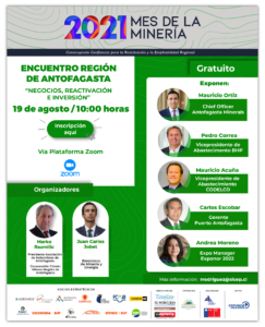El evento online, a realizarse el próximo jueves 19 de agosto, es organizado por la Asociación de Industriales de Antofagasta (AIA) y el Ministerio de Minería, en el marco de las actividades del Mes de la Minería 2021, contando con la participación de Codelco, Antofagasta Minerals, BHP y EPA.
