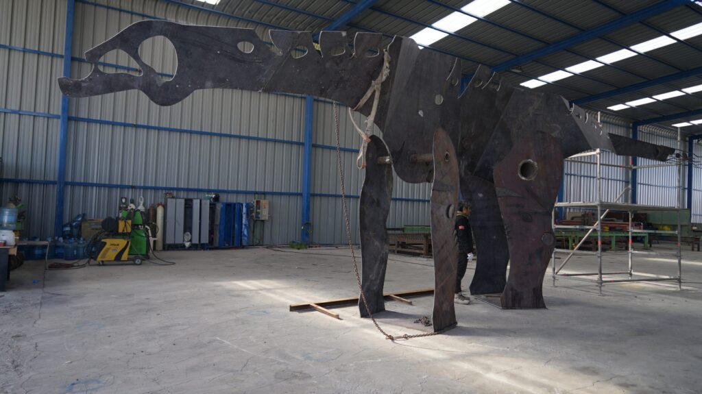 Alfaro indicó que “hemos estado utilizando el corte de estas planchas de acero, después su doblado y es como hacer casi un origami de metal, la verdad es que cortar una pieza de metal de tan grandes dimensiones, es ya una proeza y en el proyecto la idea es que las dimensiones del dinosaurio sean las mismas que teníaâ€.