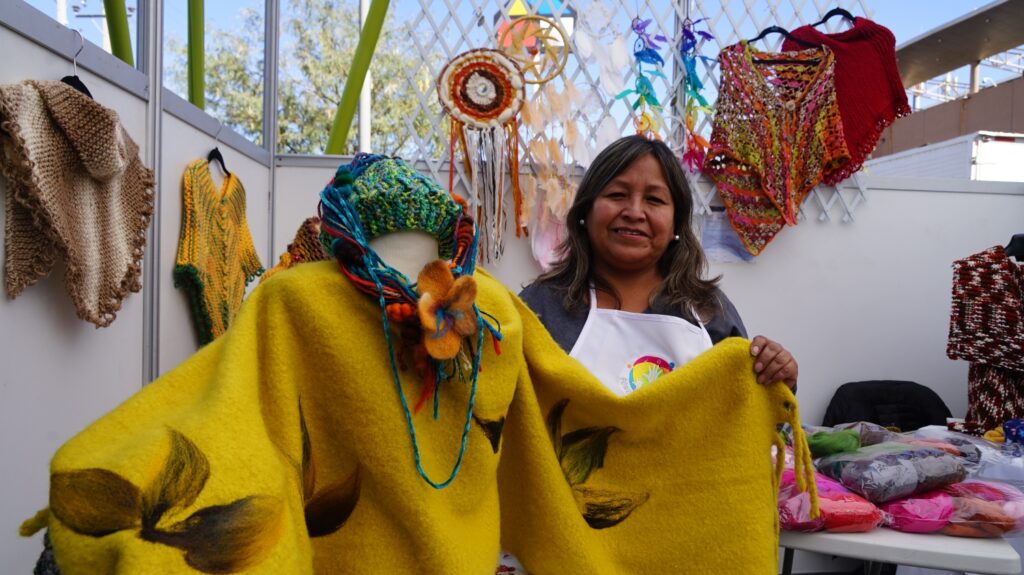 Por su parte, María Teresa Quispe, de “Creaciones Maritéâ€, quien trabaja en lanas y el rescate de las técnicas de tejido ancestral, destacó que “mi emprendimiento se trata de tejidos en lana natural, sintética y lanas antialérgicas. Todo lo trabajo en palillo, telar y croché. El fondo me ayudó a comprar hartas lanitas y muchos insumos y a terminar parte de la tienda que estoy armando en mi casa, porque tengo una microempresa familiarâ€.