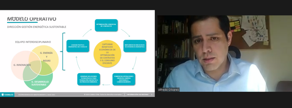 Durante la realización del webinar “Hidrógeno Verde: Energético para una Minería Sostenibleâ€, realizado por el Magíster en Economía Energética de la Universidad Técnica Federico Santa María, el Coordinador Eléctrico Nacional y el Centro Nacional de Pilotaje de Tecnologías para la Minería, el especialista de Recursos Energéticos en la Gerencia Corporativa de Suministro Estratégicos de Codelco, Alfredo Olivares, expuso sobre el camino que ha recorrido Codelco en la transición energética hacia el uso de energías limpias, destacando algunos hitos.