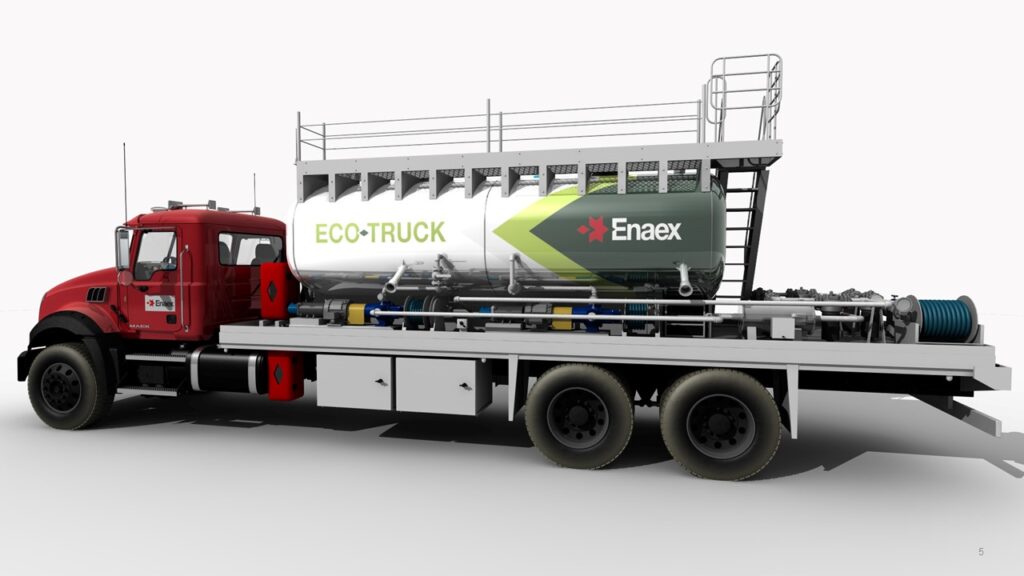 Con el objetivo de continuar profundizando la sustentabilidad en sus operaciones, y estar a la vanguardia de la industria minera a nivel global, Enaex presentó una de sus últimas innovaciones, el Ecotruck, camión que viene a eliminar el uso de los camiones reabastecedores de aceite y Diesel y así entregar versatilidad a través de la fabricación de variadas mezclas in situ, convirtiendo la fabricación de explosivos en operaciones más sustentables.