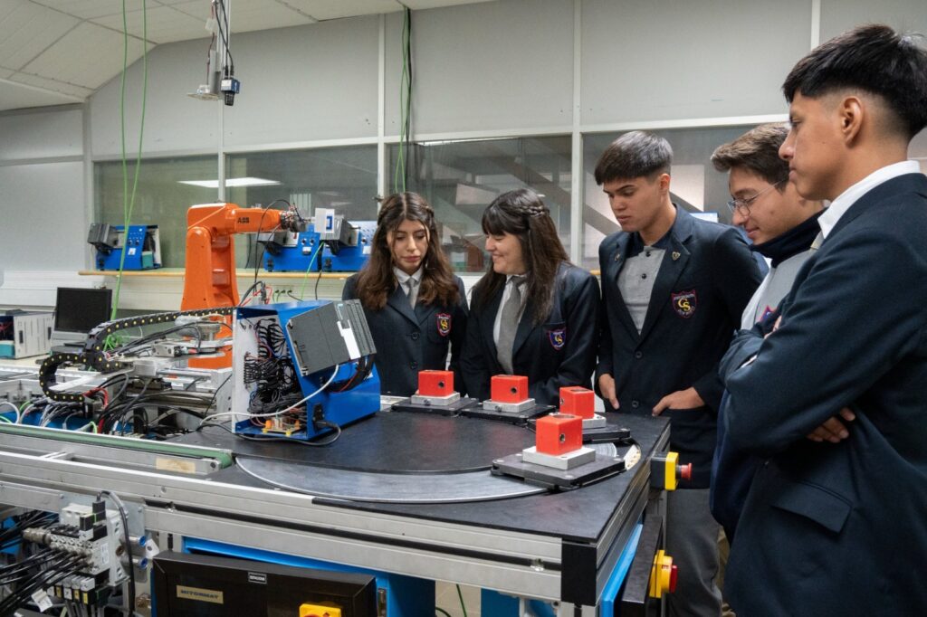 En el taller de robótica de Salesians Sarrià , en Barcelona, brazos articulados trasladan medicamentos desde un ‘almacén farmacéutico’ a un ‘punto de venta’, utilizando una cinta transportadora para su ‘despacho’. Con asombro, los estudiantes de la delegación chilena experimentan cómo funciona el software y la emoción en sus rostros delata el entusiasmo con que viven esta visita.