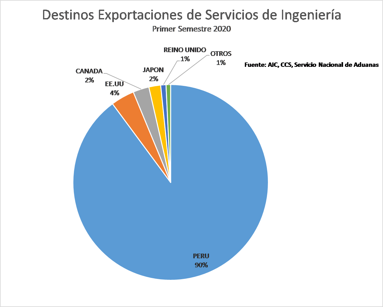 Pese a su fuerte caída, el estudio advierte que Perú sigue siendo por lejos el principal destino de las exportaciones de servicios de ingeniería chilena, con una participación del 90% sobre el total, seguido bastante más atrás por Estados Unidos, con un 4%.
