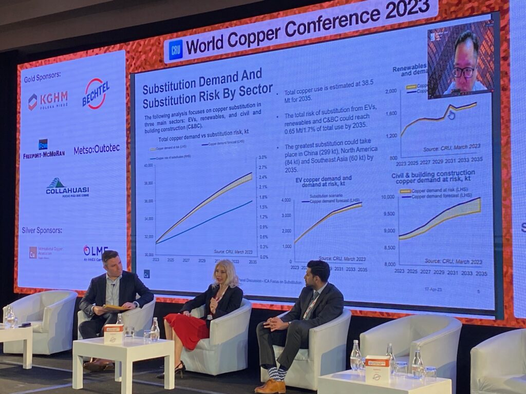 La sesión abordó las razones que explican el aumento gradual y la estabilización prevista de la sustitución del cobre, de acuerdo a lo conversado en el panel, seguirá ocupando un lugar central en los debates de la industria, ya que se espera que la demanda de este metal se duplique de aquí a 2050.