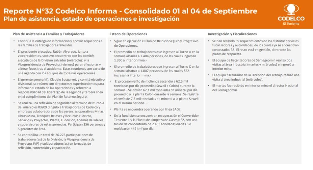 La División El Teniente, en su reporte 32 desde el accidente, informó que el gerente general (i), Claudio Sougarret, y el comité ejecutivo divisional se reunieron con directores y superintendentes para informar sobre el estado de las operaciones y reforzar la responsabilidad del liderazgo de la segunda y tercera línea en el cumplimiento del Plan de Retorno Seguro.