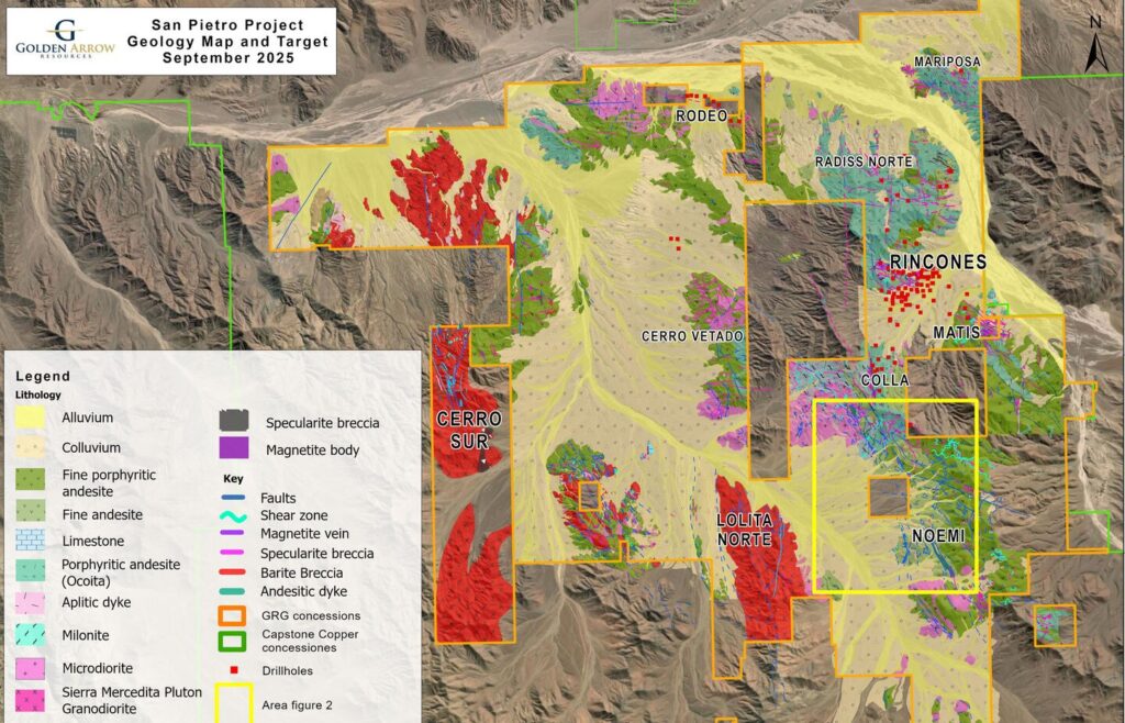 La empresa Golden Arrow informó sobre la realización de muestreos adicionales y un nuevo programa de excavación de zanjas en el nuevo objetivo Noemi, en el proyecto IOGC San Pietro, el cual tiene como finalidad el descubrimiento de múltiples yacimientos de cobre, oro, óxido de hierro y cobalto en más de 21.000 hectáreas, ubicadas a 100 kilómetros al norte de Copiapó, en la Región de Atacama.