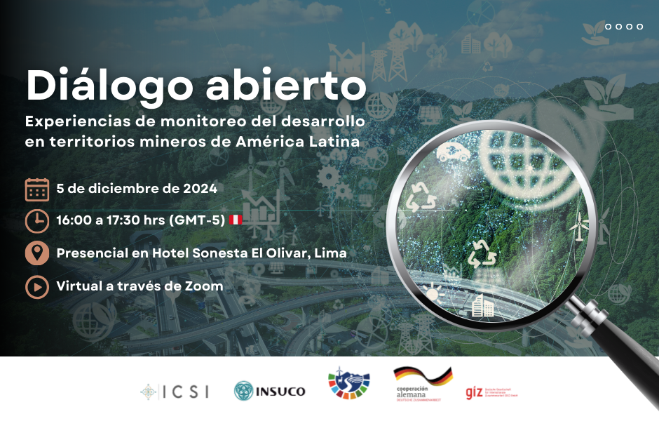 Este jueves 5 de diciembre en el Hotel Sonesta El Olivar de San Isidro – Lima, se llevará a cabo un diálogo abierto sobre “Experiencias de Monitoreo del Desarrollo en Territorios Minerosâ€, organizado por ICSI-Insuco y el Proyecto MinSus de la Cooperación Alemana.
