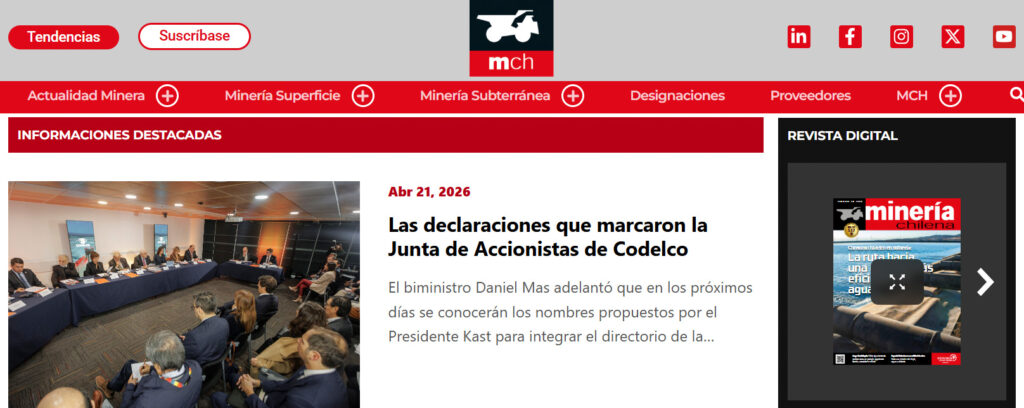 Con más de 40 años de experiencia y respaldados por empresas líderes en la industria, MINERÍA CHILENA ha actualizado su plataforma web, con el fin de facilitar a sus lectores el acceso a la información que requieren para apoyar sus decisiones, y contar con un conocimiento más acabado de los sectores en que se desempeñan.