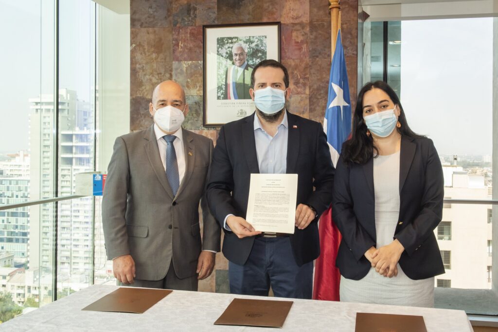 El subsecretario de Minería, Edgar Blanco, el rector de la Universidad Técnica Federico Santa María, Darcy Fuenzalida, y la representante de la Asociación de Pequeños Mineros de la Región Metropolitana, Juana Vives, se reunieron para firmar el convenio piloto de Prácticas Profesionales con la UTFSM, específicamente para los alumnos de último año de Ingeniería Civil o Ingeniería Civil de Minas.