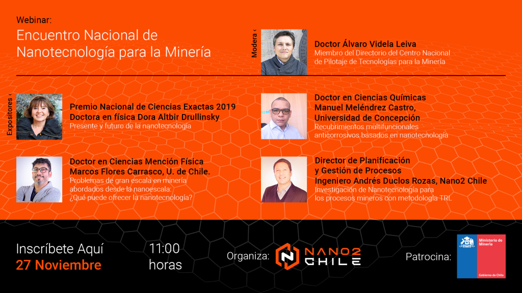 Este viernes 27 de noviembre se realizará el primer encuentro nacional de Nanotecnología para la Minería, organizado por Nano2 Chile y patrocinado por el Ministerio de Minería. El evento contará con la presencia de la Doctora en física Dora Altbir Drullinsky, galardonada del Premio Nacional de Ciencias Exactas 2019, por “su gran contribución al desarrollo en el país de la nanociencia y la nanotecnología, componentes esenciales de la denominada revolución industrial del siglo XXIâ€.