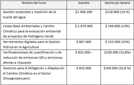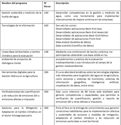 Según revelaron desde la entidad de fomento, el programa busca formar capital humano especializado con competencias en temas como gestión y huella hÃdrica, evaluación ambiental para proyectos de hidrógeno verde, tecnologÃas de la información (TI), verificación y gestión de gases de efecto invernadero y mitigación de cambio climático en el sector silvoagropecuario.