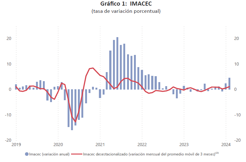 El Banco Central informó que el Ãndice Mensual de Actividad Económica (Imacec) de febrero de 2024 registró un aumento del 4,5% en comparación con el mismo mes del año anterior, según datos preliminares. Esta cifra refleja un crecimiento sólido de la economÃa chilena, respaldado por el desempeño positivo en diversas actividades económicas, expresó la institución.