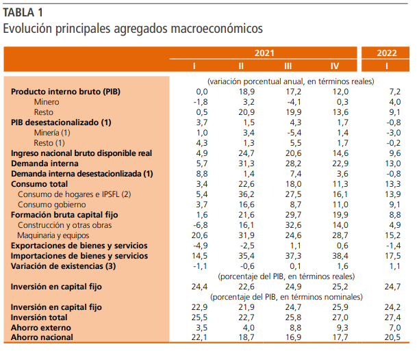 El organismo indicó que en el primer trimestre del año 2022, el Producto Interno Bruto (PIB) creció 7,2% respecto de igual periodo del año anterior; la demanda interna, en tanto, aumentó 13,0% impulsada por el consumo de los hogares.