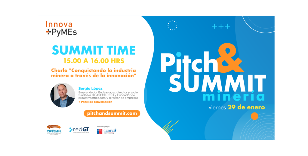 En el marco final del programa de capacitación Innova+Pymes del Centro Integrado de Pilotaje de Tecnologías Mineras (CIPTEMIN), la Red de Gestores Tecnológicos de Chile (RedGT), el próximo 29 de enero se realizará el evento de cierre gratuito online Pitch&Summit, donde quienes se registren en www.pitchandsummit.com podrán visibilizar las tecnologías de las empresas que fueron potenciadas por el programa.