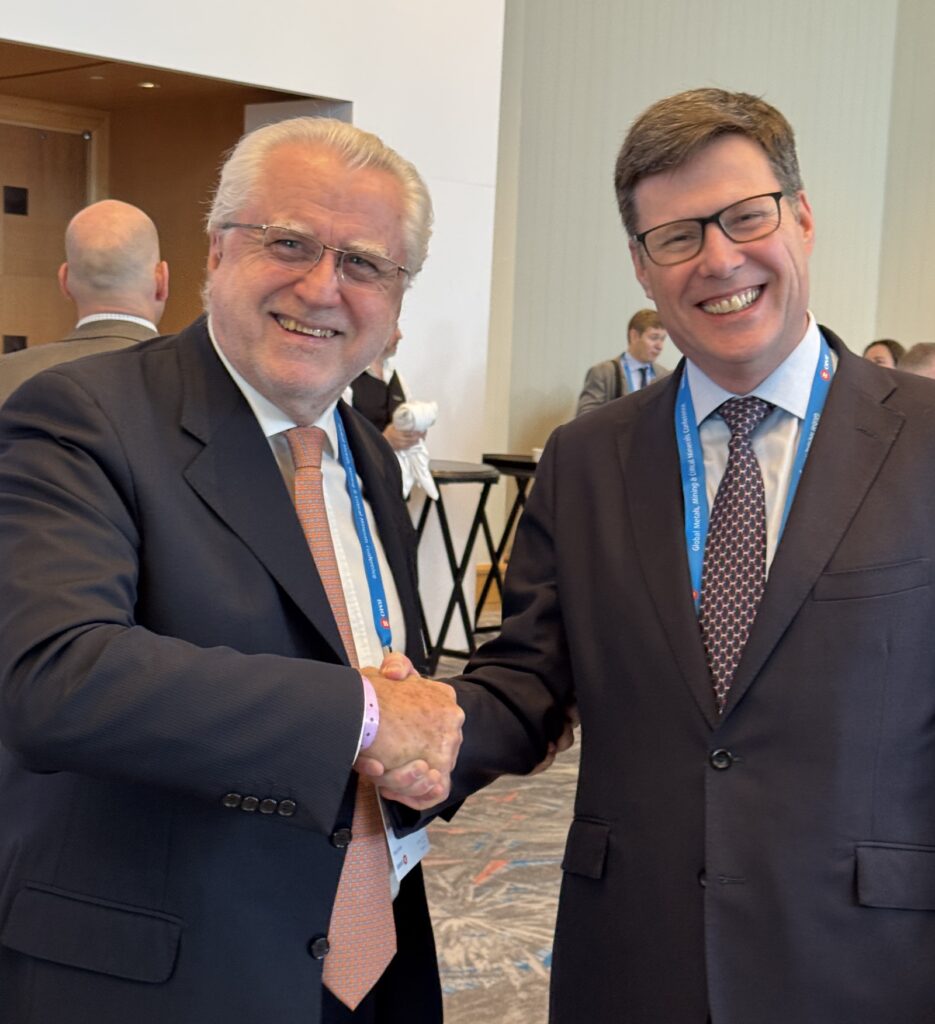 Máximo Pacheco, presidente del Directorio de Codelco, y Duncan Wanblad, presidente ejecutivo de Anglo American, coincidieron en la BMO Global Metals, Mining & Critical Minerals Conference realizada en Miami, desde donde celebraron el Memorándum de Entendimiento (MoU) recientemente firmado por ambas empresas.