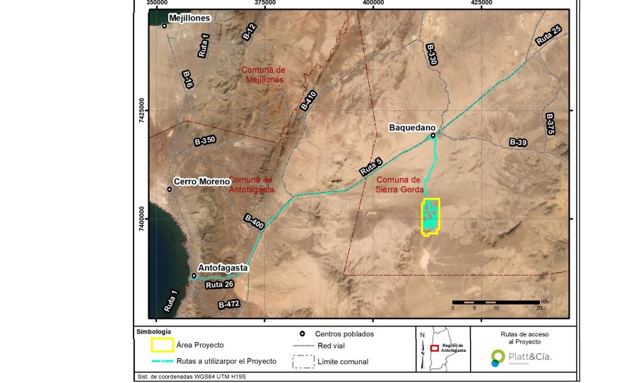El proyecto se desarrollará en el área de exploración distrito Capricornio, la cual se localiza a 60 km al noreste de la ciudad de Antofagasta, comuna de Sierra Gorda, y a unos a 15 km aproximadamente al sur de la localidad de Baquedano.