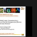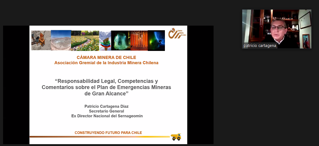 Posteriormente, Patricio Cartagena, abogado, ex vicepresidente ejecutivo de Cochilco y ex gerente de Sustentabilidad y Seguridad Codelco Norte, quien fuera director nacional de Sernageomin, analizó la situación en la que se encuentra Chile para enfrentar un accidente de la magnitud de los 33 mineros. También ese refirió a la responsabilidad legal ante los accidentes mineros y sobre las oportunidades de mejora del Plan Específico de Emergencias Mineras de Gran Alcance, haciendo ver la urgente necesidad de articular y colaborar con la industria minera, en técnicas, procedimientos, equipos y financiamiento ante tales riesgos.