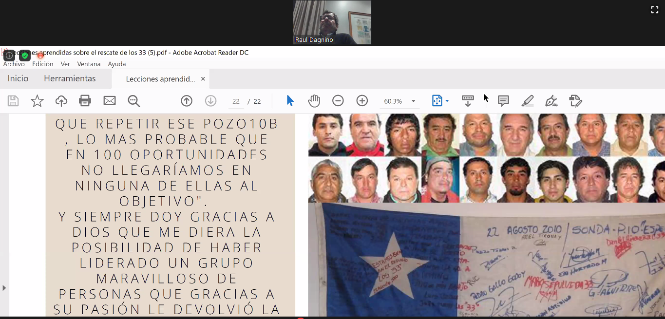 En su presentación, se refirió a la historia de los sondajes que se realizaron, a las etapas del rescate y sus desafíos; el desarrollo del pozo 10, oportunidad en la que indicó que allí se instaló la sonda en una plataforma más elevada, y a pesar de las desviaciones, las ansias de poder rescatarlos los hicieron seguir intentándolo, lo que los llevó a un rescate exitoso.