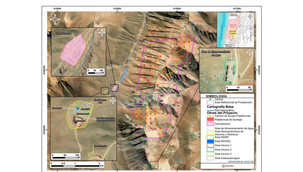 Para la implementación de lo anterior, el proyecto requerirá la habilitación de caminos de acceso a las plataformas proyectadas, un campamento definitivo, un área de almacenamiento de agua para perforación y áreas para el almacenamiento de insumos y residuos. De igual forma, considerará actividades de transporte de lodos de perforación al interior del área del proyecto y actividades de transporte de personal, insumos, residuos, muestras y maquinaria entre Vallenar y el área del Proyecto.