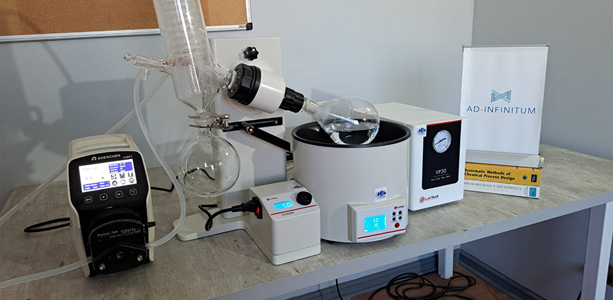 En el laboratorio de Ad Infinitum en Antofagasta están realizando pruebas con un Evaporador Rotatorio al Vacío y un Túnel de Viento, dos equipos clave para simular el proceso de evaporación de salmueras bajo condiciones controladas.