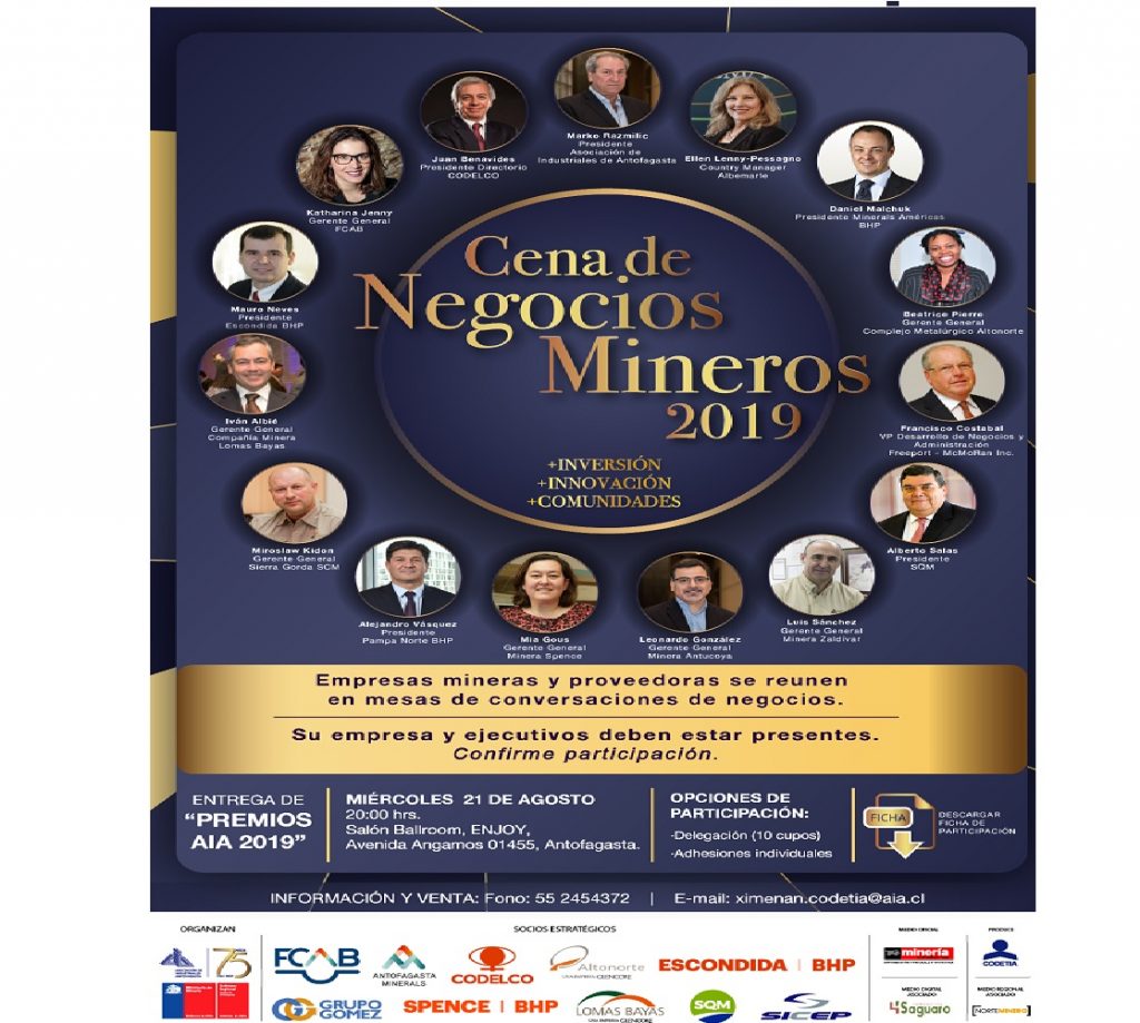 Más de 500 personas entre ejecutivos de empresas, líderes gremiales y autoridades locales, regionales y nacionales, espera reunir la Asociación de Industriales de Antofagasta (AIA) en su próxima Cena de Negocios Mineros. La actividad busca fortalecer lazos entre los diferentes actores que inciden en la minería, así como generar nuevas redes que contribuyan al encadenamiento productivo.