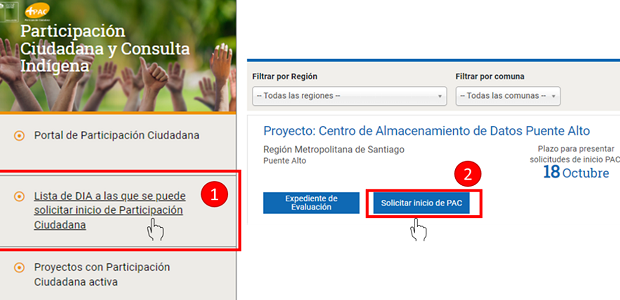 Como parte de su proceso de mejora continua, el Servicio de Evaluación Ambiental (SEA) implementó en su portal web de Participación Ciudadana (PAC) una nueva funcionalidad, que permitirá realizar solicitudes de inicio del proceso PAC para Declaraciones de Impacto Ambiental (DIA) que se encuentran en evaluación.