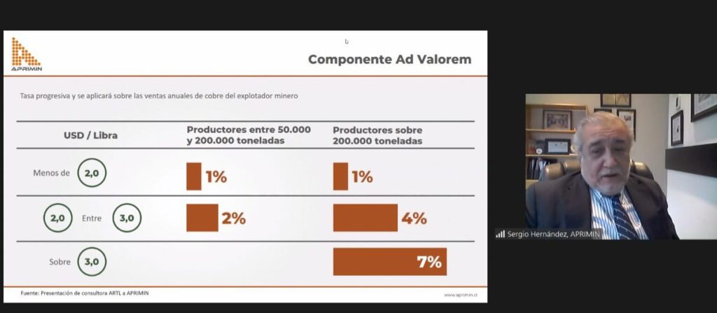 La propuesta de Royalty contempla dos componentes, uno ad valorem (sobre ventas) entre 1% y un 2% para productores entre 50.000 mt y 200.000 mt; mientras que se aplicará entre un 1% y un 7% para aquellos con más de 200.000 mt. “Esta tasa varía respecto al precio del cobre y no respecto a las utilidadesâ€, mencionó Hernández. Después hay un segundo componente sobre la renta minera que varía entre 2% y 32% en la rentabilidad operacional con precios entre US$ 2 y US$ 5 por libra.