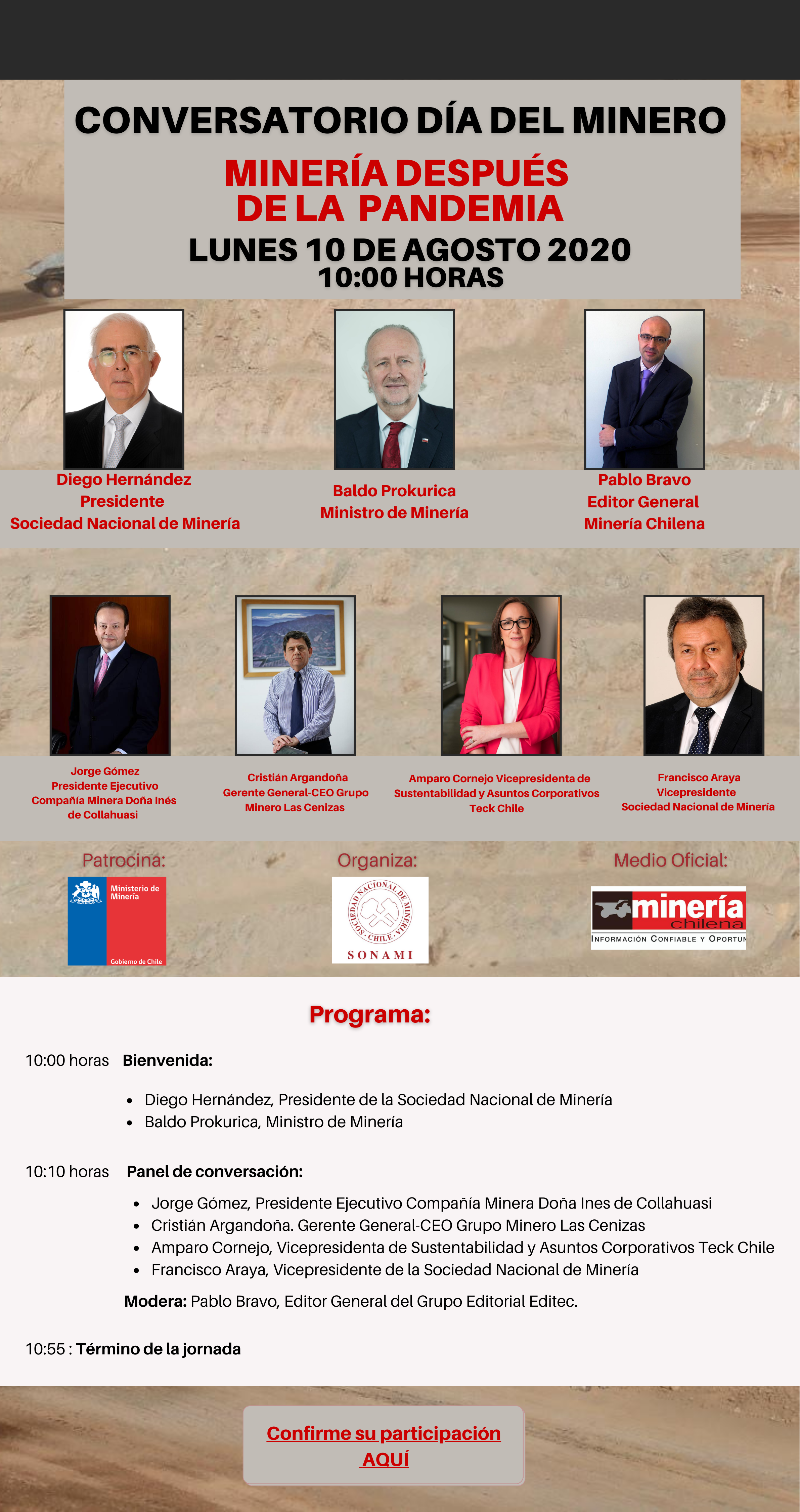 “Minería, Después de la Pandemia†se denomina el evento con el cual la Sociedad Nacional de Minería (Sonami) celebrará este año el Día del Minero. Y reflejando la nueva realidad que ha impuesto la pandemia, así como el claro compromiso del sector con privilegiar la salud y seguridad de las personas, el formato elegido es un conversatorio online con importantes actores de la industria.