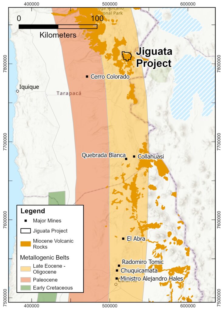 La Propiedad Jiguatá se ubica en la prolongación norte del cinturón metalogénico del Eoceno-Oligoceno del norte de Chile, donde se encuentra sobreimpresa por el cinturón magmático del Mioceno.