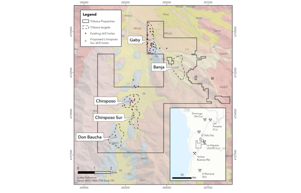 El CEO de Tribeca Resources, doctor Paul Gow, comentó que «actualmente tenemos dos campañas de terreno muy atractivas en marcha. Ya se prepararon las plataformas de perforación y un equipo de sondaje diamantino se está movilizando hacia Chirsposo Sur, objetivo que creemos presenta una firma geofísica, mineralogía de magnetita y contexto estructural similares a nuestro descubrimiento IOCG Gaby”.