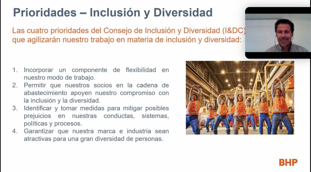 Por su parte, Héctor Gómez, Principal HR Business Partner de BHP, expuso los principales pilares que han llevado a BHP-Cerro Colorado, a una transformación cultural que los consolide como una compañía diversa e inclusiva: Flexibilidad, apoyo y compromiso de socios, mitigación de prejuicios y la garantía de una marca e industria que sean atractivas para una gran diversidad de personas.